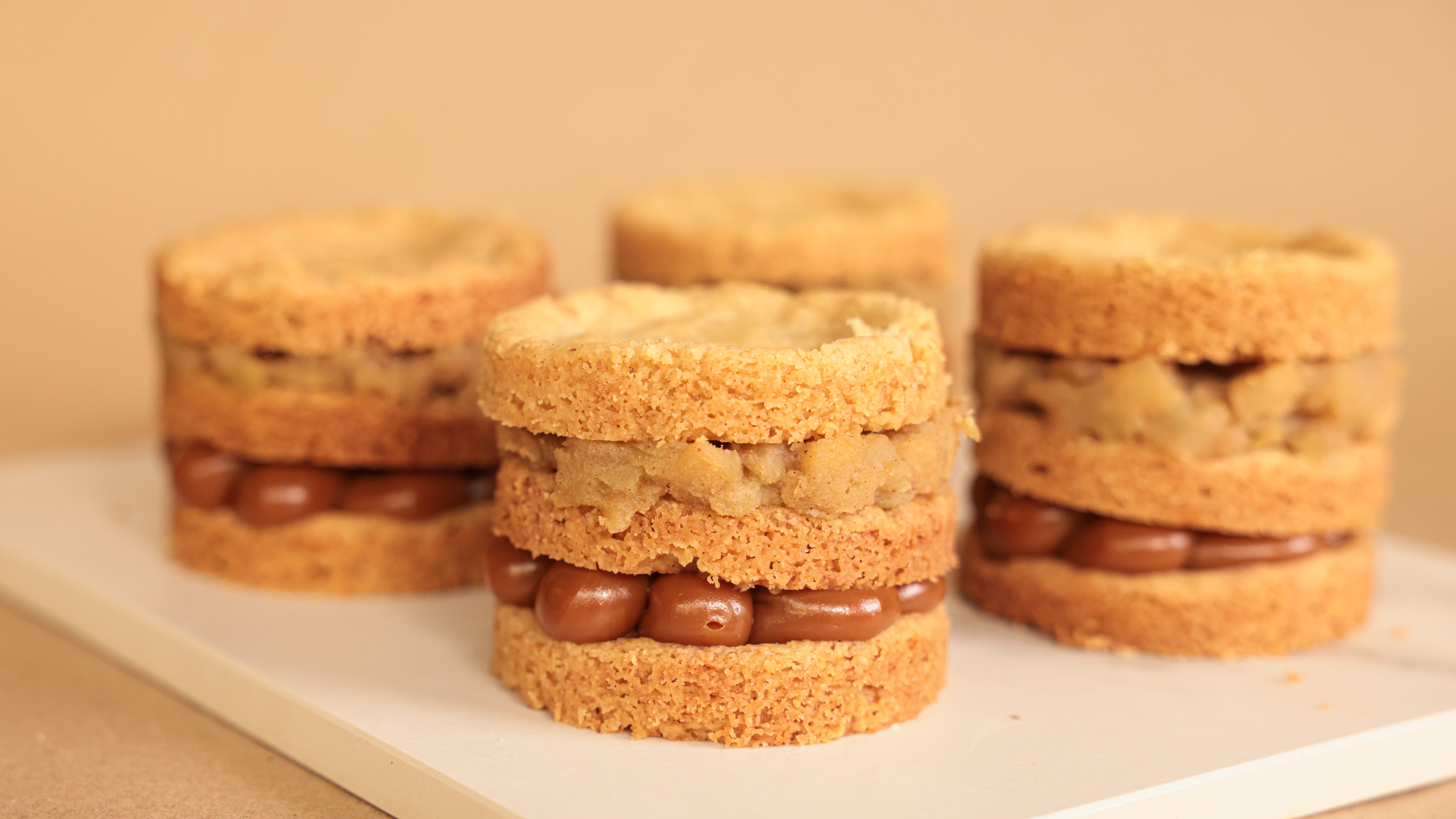 Crocante de nuez, compota de manzana, dulce de leche y azucar impalpable